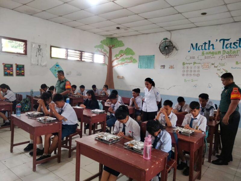 “Menu yang dibagikan terdiri dari nasi putih, ayam bumbu, tempe mendoan, tumis buncis dan wortel, serta buah salak. Seluruh makanan disiapkan secara higienis dan mengandung gizi seimbang yang disesuaikan dengan kebutuhan anak-anak di setiap jenjang,” sebut Serma Sutrisno. Kamis (22/05/2025) siang.