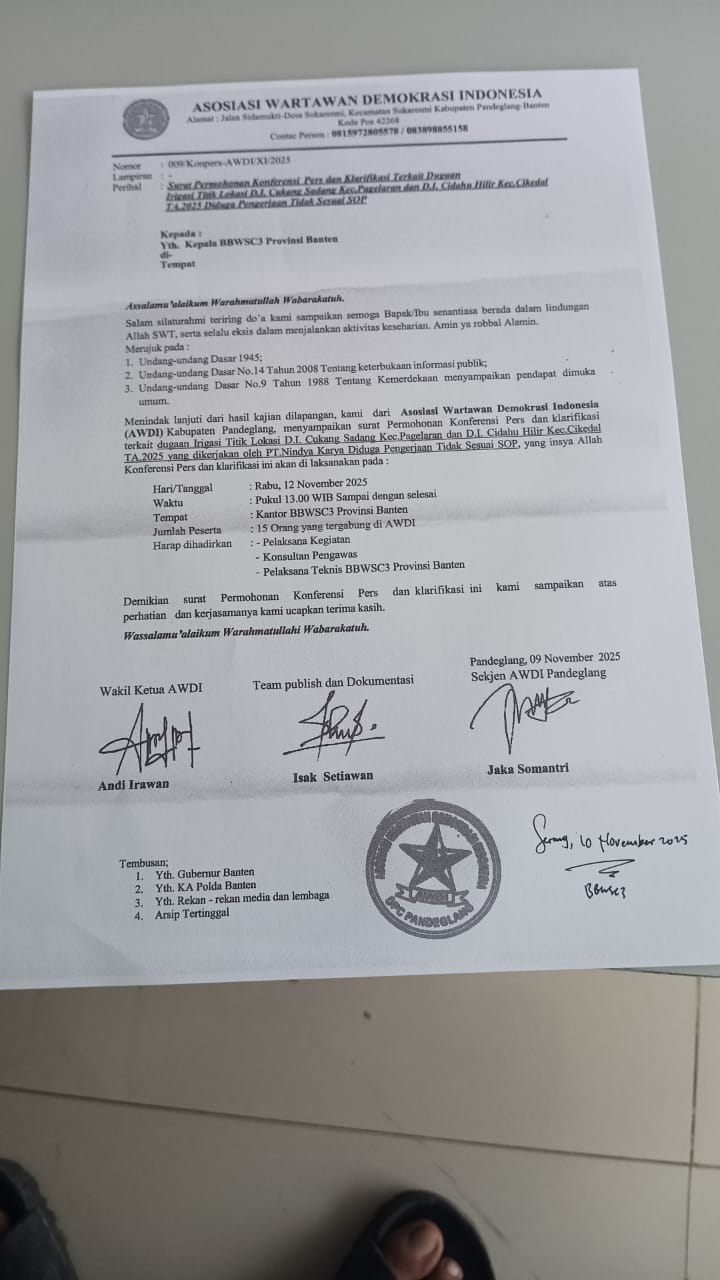 Asosiasi Wartawan Demokrasi Indonesia (AWDI) DPC Kabupaten Pandeglang resmi melayangkan surat konferensi pers dan permohonan klarifikasi ke Kantor Balai Besar Wilayah Sungai Cidanau–Ciujung–Cidurian (BBWS C3) Provinsi Banten, menyoal dugaan pelaksanaan proyek pembangunan irigasi bernilai ratusan miliar rupiah yang tidak sesuai spesifikasi teknis.