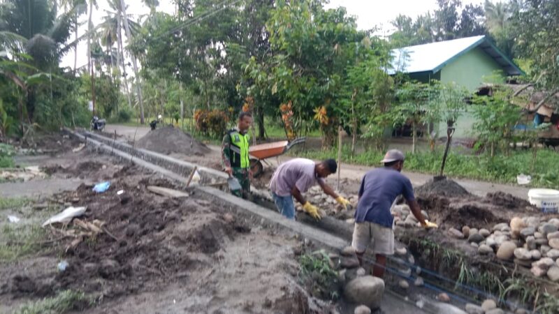 Babinsa Posramil Peusangan Siblah Krueng, Serda R. Bintoro turut membantu warga Desa Kubu, Kecamatan Peusangan Siblah Krueng, Kabupaten Bireuen, dalam kegiatan pembuatan parit. Jumat (19/09/2025).