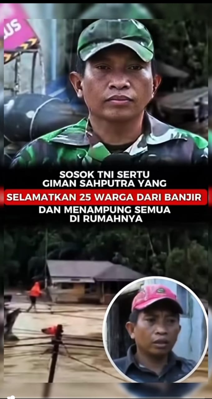 Bencana banjir akibat meluapnya sungai membuat sejumlah wilayah terendam hingga ketinggian air mencapai sekitar tiga meter. Dalam kondisi tersebut, Sertu Giman Saputra turun langsung ke lokasi dengan merakit alat evakuasi darurat dari tali, ban dalam bekas, dan pelampung sederhana. Aksi itu dilakukan setelah mendengar jeritan warga yang meminta pertolongan.