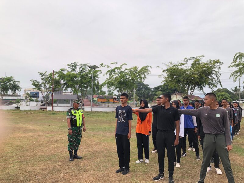Serka K. Samosir, Babinsa Koramil 01/Bireuen Kodim 0111/Bireuen, memberikan materi Peraturan Baris Berbaris (PBB) kepada siswa-siswi Pramuka SMA Negeri 1 Bireuen di Lapangan Bola Cot Gapu, Desa Cot Gapu, Kecamatan Kota Juang, Kabupaten Bireuen. Minggu (24/08/2025).
