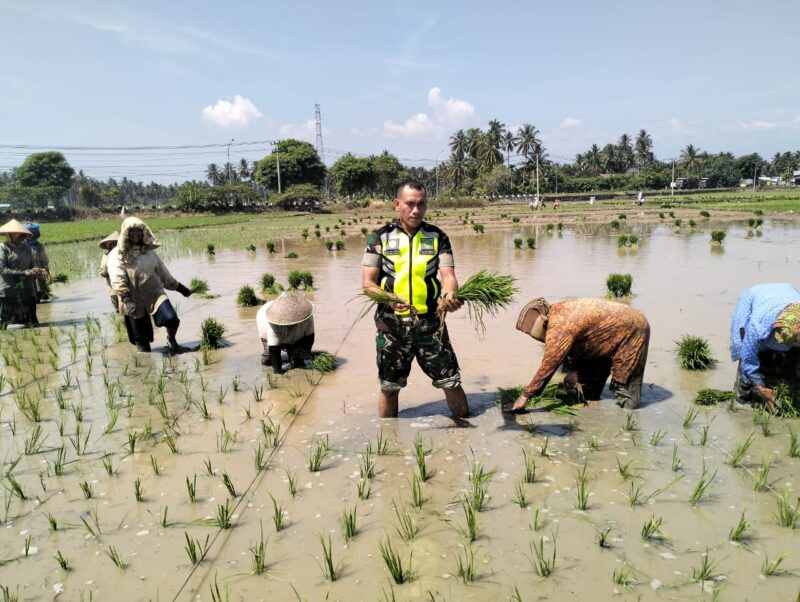 Serma Donner Sipangkar, Babinsa Posramil Peulimbang Kodim 0111/Bireuen, turun langsung ke sawah membantu masyarakat menanam padi di Desa Uteuen Sikumbong, Kecamatan Peulimbang, Kabupaten Bireuen. Kegiatan ini merupakan bagian dari upaya mendukung program pemerintah dalam mewujudkan swasembada pangan. Minggu (24/08/2025).