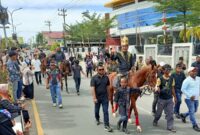 BIREUEN/Tribuneindonesia.com Bupati Bireuen, H. Mukhlis, mencuri perhatian warga saat menunggang kuda mengenakan pakaian adat khas daerah dalam pawai budaya bertajuk “Jejak Sejarah Bumoe Jeumpa”…