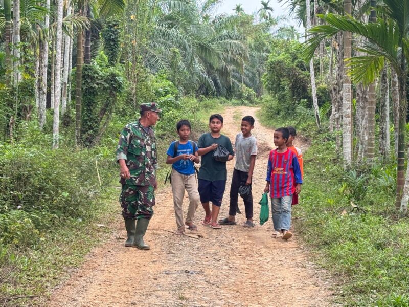 Di sebuah jalan tanah yang membelah kebun, langkah-langkah sederhana itu terasa begitu sangat berarti. Tidak ada upacara, tidak ada barisan resmi, yang ada hanyalah kebersamaan yang mengalir alami antara Prajurit Satgas TMMD ke-127 TA. 2026 Kodim 0111/Bireuen dengan anak-anak Desa Jeumpa Sikureng, tepatnya terletak di Kecamatan Jeunib Kabupaten Bireuen. Sabtu (21/2/2026).