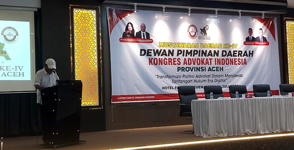 Dewan Pimpinan Daerah Kongres Advokat Indonesia (DPD KAI) Provinsi Aceh menggelar Musyawarah Daerah (Musda) ke-IV dengan tema “Transformasi Profesi Advokat dalam Menjawab Tantangan Hukum Era Digital”. bertempat di Aula Hotel Fajar Bireuen. Sabtu 26 Juli 2025.