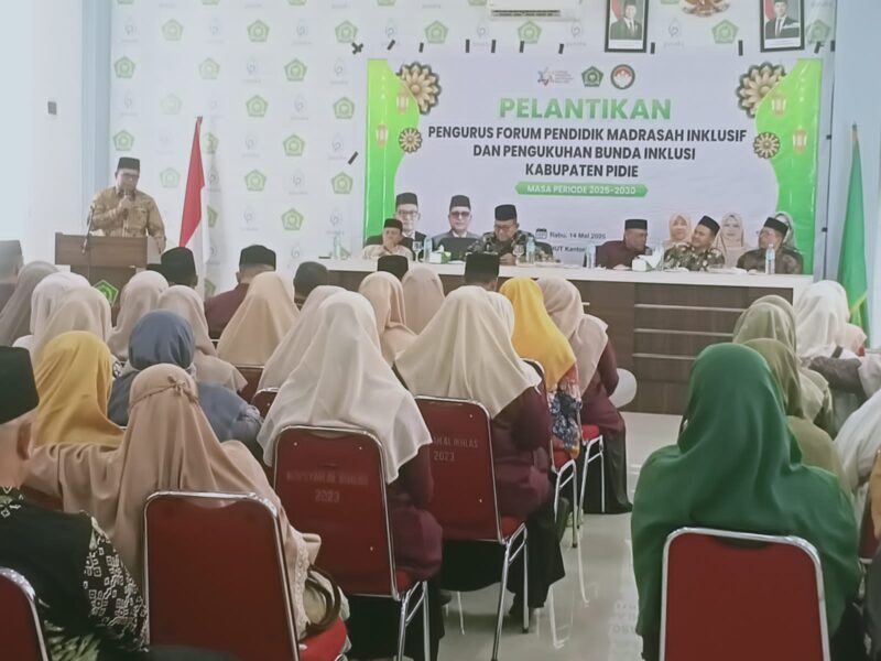 Kepala Kantor Wilayah Kementerian Agama (Kakanwil Kemenag) Aceh, Dr H Azhari Msi,resmi melantik dan Mengukuhkan Pengurus Forum Pendidik Madrasah Inklusif (FPMI) serta pengurus Bunda Iklusi,di aula Pusat Layanan Haji dan Umrah Terpadu (PLHUT) Kankemenag Pidie.Rabu (14/5/2025).