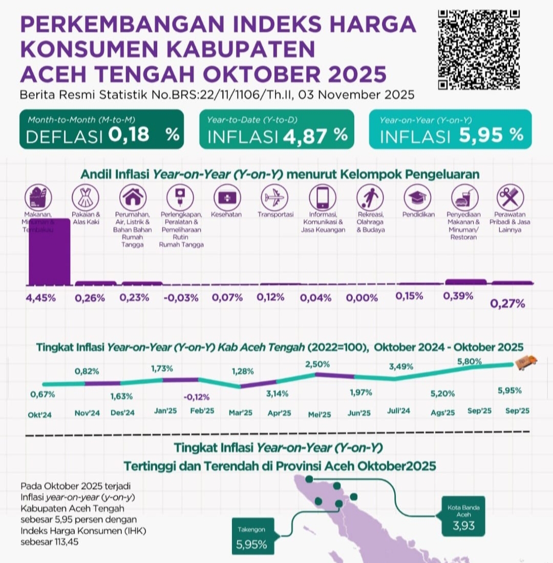 Takengon | Kabupaten Aceh Tengah kembali mencatat inflasi tertinggi di Provinsi Aceh selama 3 bulan berturut-turut sejak Agustus 2025.