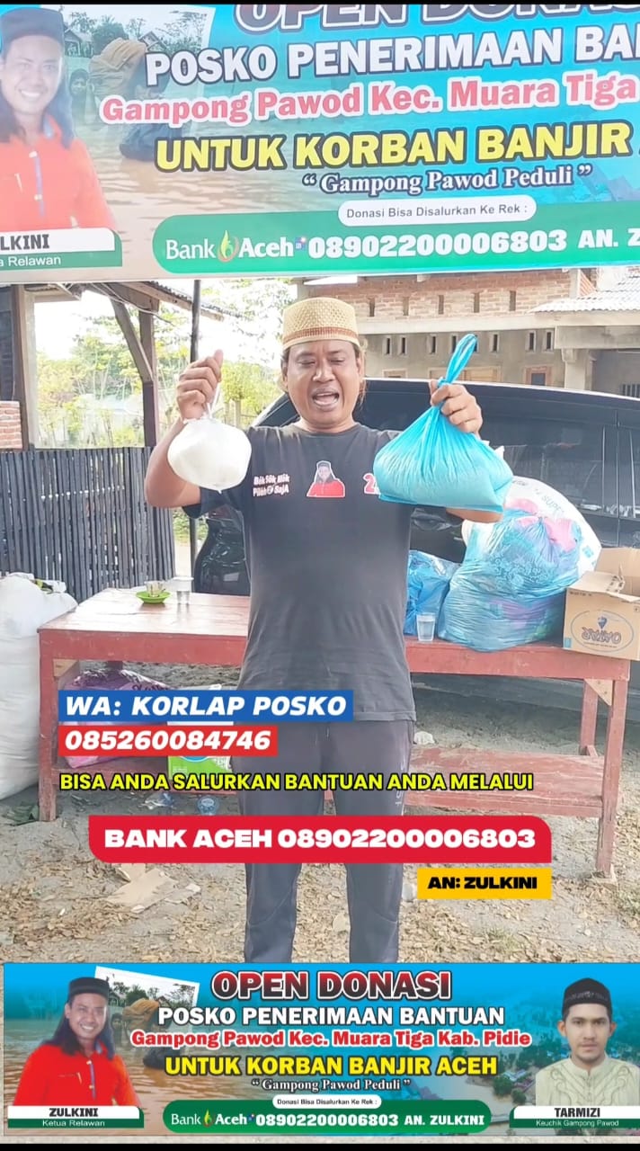 Muara Tiga-Masyarakat Gampong Pawod Peduli Kecamatan Muara Tiga, Kabupaten Pidie,telah menunjukkan solidaritas tinggi dengan mendirikan posko donasi untuk membantu warga yang terdampak pasca-banjir di Pidie Jaya. Kegiatan kemanusiaan ini dipimpin oleh para relawan yang tergabung dalam Gampong Pawod Peduli, bekerja sama dengan Geuchik Tarmizi Gampong Pawod, pemuda, perangkat gampong, serta seluruh stakeholder lainnya.