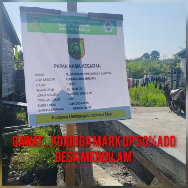 Proyek pembangunan jembatan di Kampong Mendilam, Kecamatan Rundeng, Kota Subulussalam, kini menuai sorotan publik. Jembatan yang dibangun menggunakan Dana Desa (DD) senilai Rp48 juta ini diduga kuat mengalami mark up hingga 50 persen dari nilai riil pekerjaan. Tak hanya itu, proyek ini juga disinyalir tumpang tindih dan tidak transparan.