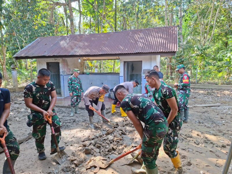 Komandan Koramil 10 Simpang Jernih, Kapten Infanteri Edi Chandra, turun langsung ke lokasi bersama Kapolsek Simpang Jernih, IPDA Safwadinur, S.H., M.H. Keduanya terlihat ikut serta membersihkan lumpur bersama Babinsa, Bhabinkamtibmas, pasukan Yon TP 853/BRB, serta masyarakat setempat.