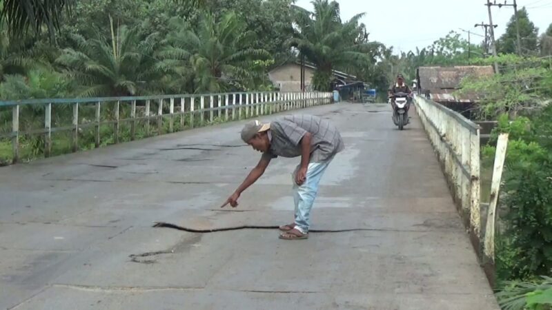 Menurutnya, jembatan tersebut dibangun bukan dengan material permanen seperti aspal atau beton, melainkan hanya menggunakan plat besi yang kini mulai keropos.