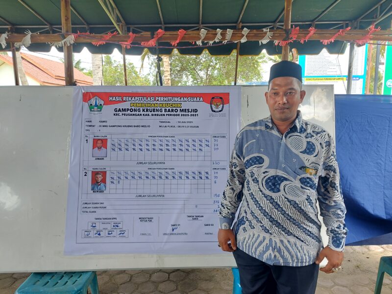 “Dari perolehan suara terbanyak pada pemilihan keuchiek pada hari ini, maka Nomor urut (2) Junaidi terpilihlah sebagai Keuchik Definitif di Krueng baro mesjid kecamatan Peusangan Bireuen, untuk Periode 2025–2031” sebutnya, Ikhwan,SH ketua P2K.