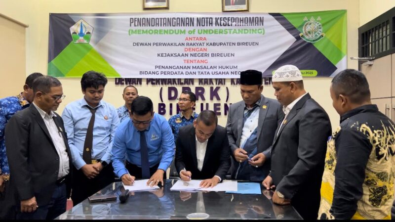 Bertempat di Ruang Rapat DPRK Bireuen, Kepala Kejaksaan Negeri Bireuen Munawal Hadi .S.H.M.H. bersama dengan Ketua Dewan Perwakilan Rakyat Kabupaten (DPRK) Bireuen Juniadi.S.H melakukan Penandatanganan Kesepakatan Bersama (MoU) tentang Penanganan Masalah Hukum Bidang Perdata dan tata Usaha Negara. Kamis,17 Juli 2025.