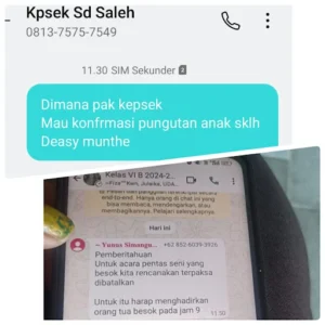 Saat dikonfirmasi, Muhammad Saleh S.Pd tak ada di sekolah. Awak media mencoba menghubungi lewat SMS, namun hanya mendapat jawaban berbelit.