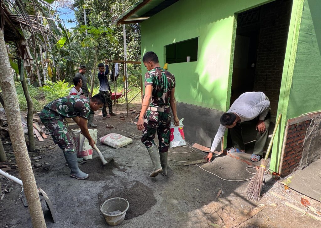 Terlihat personel Satgas TMMD bersama warga setempat bahu-membahu mengaduk serta menuangkan campuran semen untuk memperkuat dinding bagian bawah rumah. Tahap pengerasan ini menjadi bagian penting dalam proses rehabilitasi, guna memastikan bangunan lebih kokoh, tahan lama, dan nyaman dihuni.