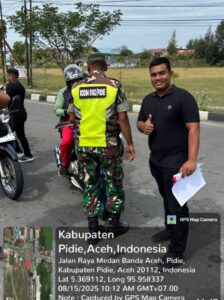Sigli — Dalam rangka memeriahkan Hari Ulang Tahun ke-80 Republik Indonesia, Kodim 0102/Pidie bersama Pengurus Daerah Ikatan Wartawan Online (PD-IWO) Pidie dan Pidie Jaya menggelar aksi pembagian bendera Merah Putih kepada para pengguna jalan di wilayah Kabupaten Pidie. Kegiatan ini dipusatkan di Simpang Tugu Aneuk Meulieng, Kota Sigli, dan berlangsung penuh semangat kebersamaan pada Jumat (15/8/25).