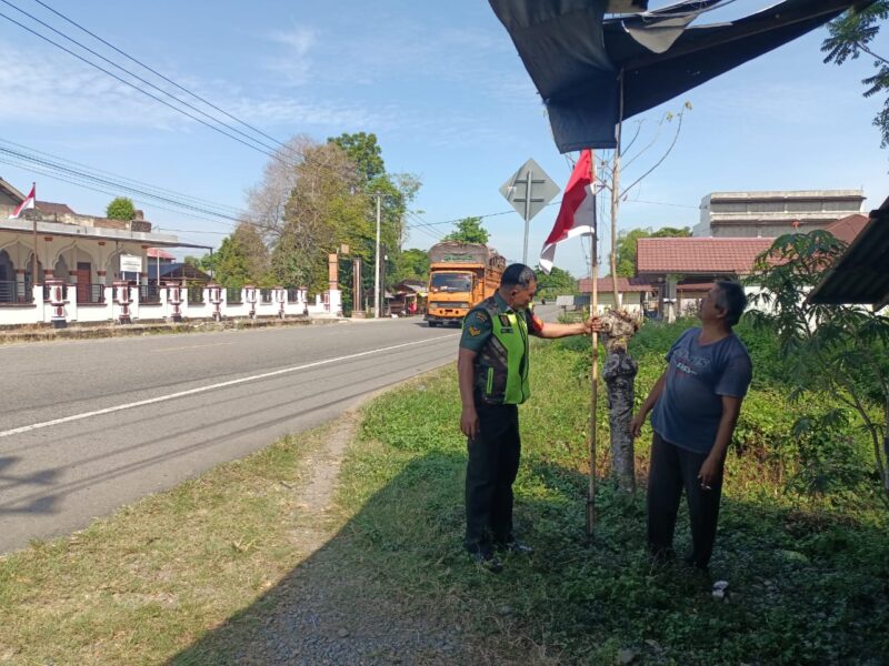 Babinsa Koramil 11/Bandar Baru,Sertu Pastijaya Gulo,bersama Geusyik Salamuddin Desa Musa Balee,Kec.Bandar Baru,Kab.Pidie Jaya,secara langsung menghimbau warga agar mulai memasang bendera Merah Putih di depan rumah, kantor, dan tempat usaha mulai tanggal 1 hingga 31 Agustus 2025.