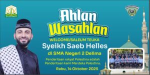 Sigli-Suasana haru dan semangat kebersamaan mewarnai acara penyambutan kedatangan Syeikh Saeb Helles di SMA Negeri 2 Delima. Dalam kegiatan bertajuk “Ahlan Wasahlan Syeikh Saeb Helles”, pihak sekolah bersama para guru dan siswa menyampaikan dukungan moral dan spiritual kepada rakyat Palestina yang hingga kini masih berjuang mempertahankan tanah air dan kehormatannya,Rabu,15/10.