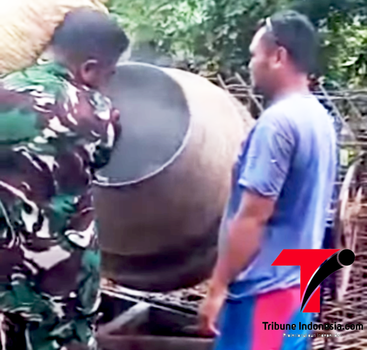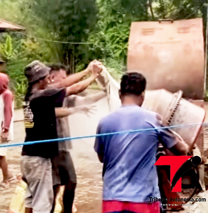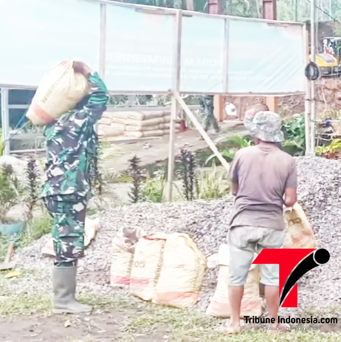 Warga terpantau aktif bahu-membahu melakukan gotong royong bersama personel TNI dan para pekerja konstruksi di lapangan.