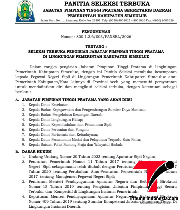Pemerintah Kabupaten Simeulue melalui Panitia Seleksi resmi membuka Seleksi Terbuka Pengisian Jabatan Pimpinan Tinggi (JPT) Pratama Tahun 2026.