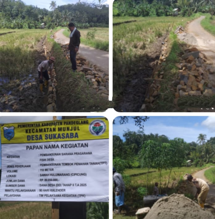 Pembangunan infrastruktur menjadi salah satu faktor penting dalam meningkatkan kualitas hidup dan perekonomian masyarakat desa. Salah satu upaya nyata dilakukan oleh Pemerintah Desa Sukasaba, Kecamatan Munjul, Kabupaten Pandeglang, Provinsi Banten, melalui pembangunan Tembok Penahan Tanah (TPT) di Kampung Sawah Huluwarang, Cipicung.