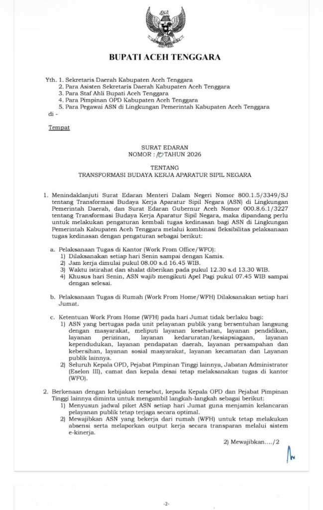 ACEH TENGGARA – Pemerintah Kabupaten Aceh Tenggara resmi menerapkan sistem kerja fleksibel bagi Aparatur Sipil Negara (ASN) melalui kebijakan Work From Home (WFH) setiap hari Jumat. Kebijakan ini tertuang dalam Surat Edaran Bupati Aceh Tenggara tentang Transformasi Budaya Kerja ASN tahun 2026.