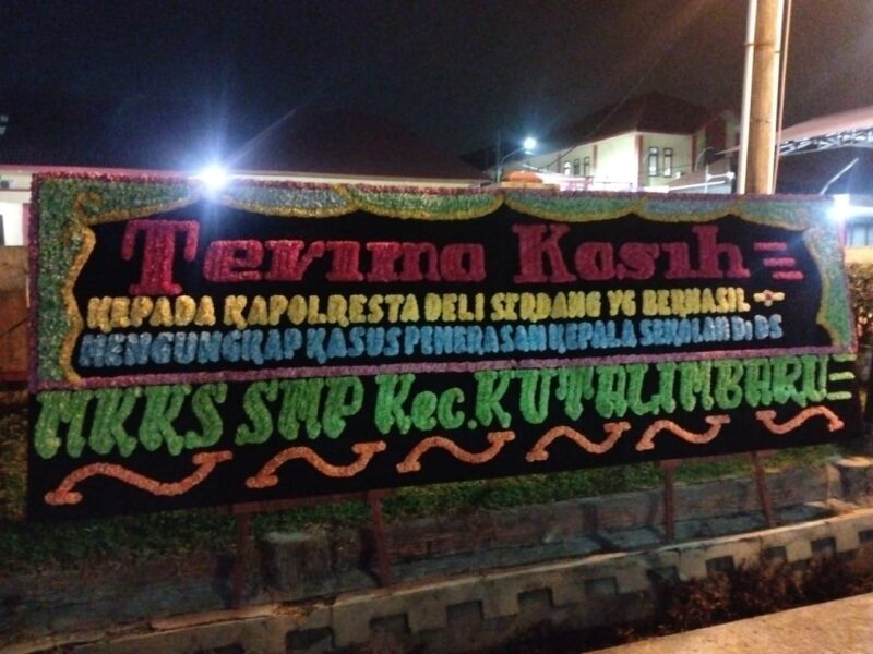 Puluhan papan bunga berjajar rapi di depan Polresta Deli Serdang sebagai bentuk dukungan dan ucapan terima kasih kepada Kapolresta atas pengungkapan dugaan pemerasan oleh tiga oknum wartawan terhadap Kepala Sekolah MS dari SD Negeri 101928.