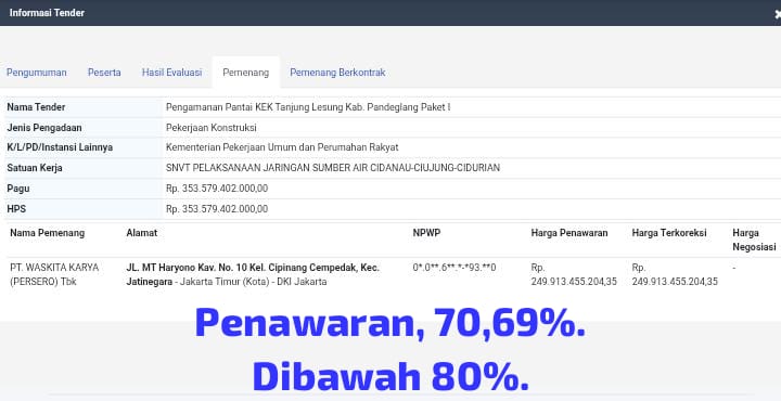 Sumber internal menyebutkan, PT. Waskita Karya (Persero) Tbk melakukan penawaran di bawah 80% dari Harga Perkiraan Sendiri (HPS), yang semestinya sudah menjadi indikator serius atas potensi turunnya kualitas pekerjaan. Ketika nilai penawaran ditekan terlalu rendah, konsekuensi logisnya adalah pemangkasan kualitas material dan spesifikasi teknis yang akhirnya merugikan kepentingan publik.