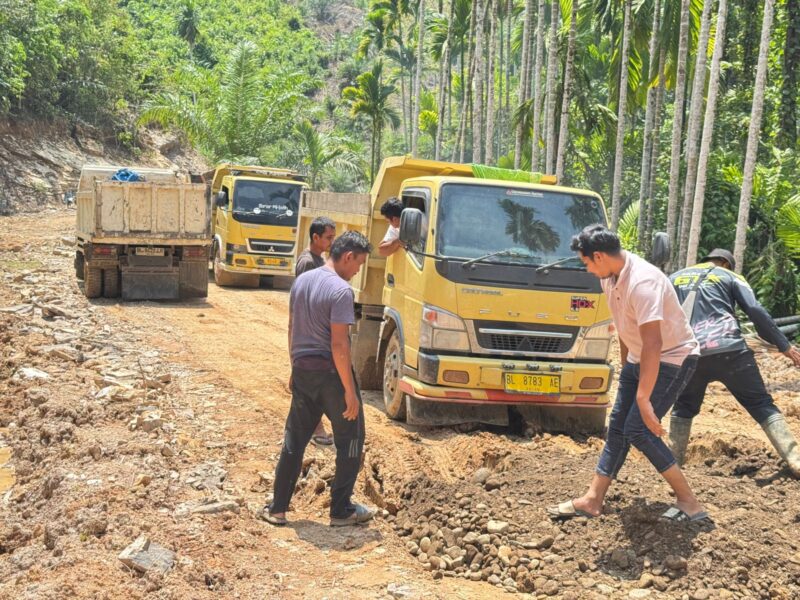 Material batu yang diangkut menggunakan kendaraan dump truck diturunkan langsung di badan jalan sebagai bagian dari proses pengerasan. Anggota Satgas TMMD terlihat sigap mengatur penempatan material agar proses pemerataan dan pemadatan dapat berjalan maksimal.