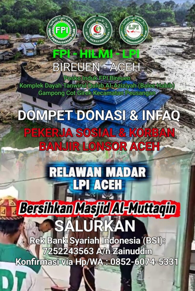 Dewan Pimpinan Wilayah Front Persaudaraan Islam (FPI) Bireuen membuka dompet donasi infaq untuk kebutuhan pekerja sosial dan korban banjir tanah longsor. Kami juga membuka pendaftaran anggota pekerja sosial untuk membersihkan masjid dan meunasah yang terkena dampak banjir. Kamis 17 Desember 2025.