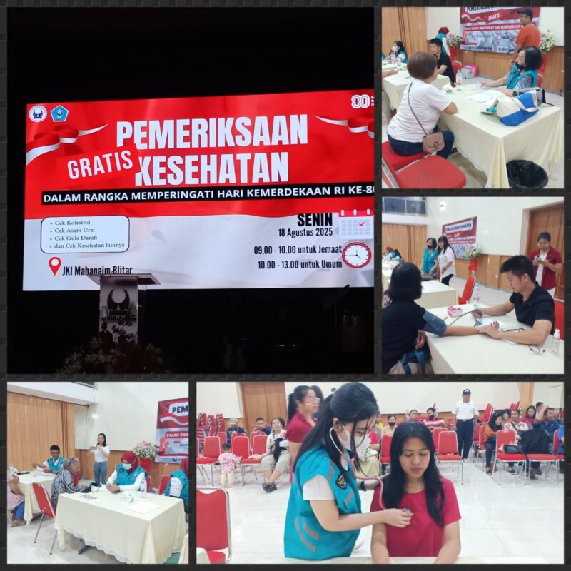 Dalam rangka memperingati Hari Kemerdekaan RI ke – 80 Gereja JKI Mahanaim bekerjasama dengan RSUD Ngudi Waluyo Wlingi bersama jemaat dan panitia pelaksana mengadakan Bakti Sosial Pemeriksaan Kesehatan Gratis bagi masyarakat umum pada Senin ( 18/8 ).