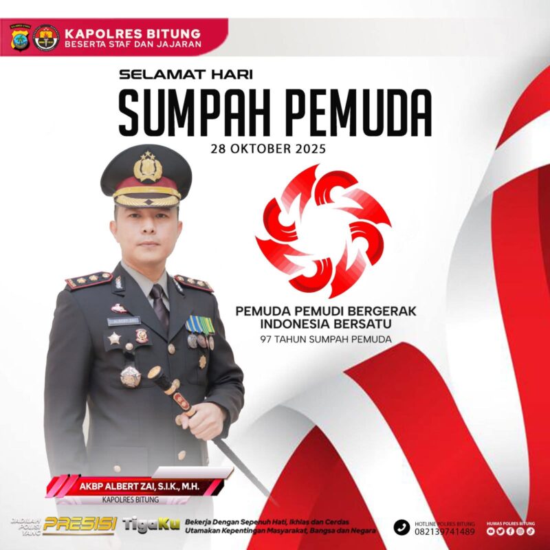 Kapolres Bitung AKBP Albert Zai, S.I.K., M.H., beserta seluruh staf dan jajaran secara resmi menyampaikan ucapan selamat dan memompa semangat kebangsaan kepada seluruh pemuda-pemudi di Indonesia.