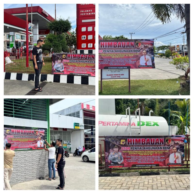 Sigli – Polres Pidie melalui Unit Tindak Pidana Tertentu (Tipidter) Sat Reskrim melakukan pemasangan spanduk himbauan terkait pencegahan penyalahgunaan Bahan Bakar Minyak (BBM) bersubsidi di sejumlah Stasiun Pengisian Bahan Bakar Umum (SPBU) dalam wilayah hukum Polres Pidie, Minggu (28/9/2025) siang.