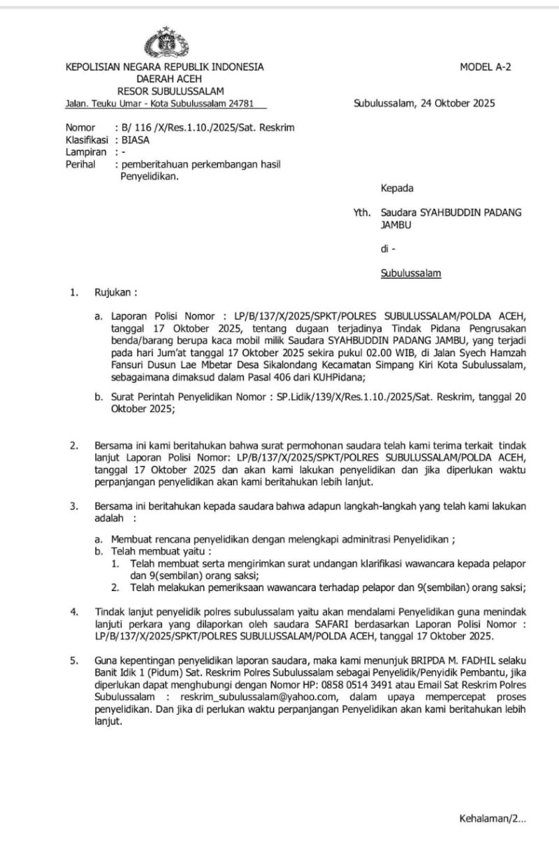 Dalam Surat Pemberitahuan Perkembangan Hasil Penyelidikan (SP2HP) yang diterbitkan Polres Subulussalam pada 24 Oktober 2025, disebutkan bahwa penyidik telah menerima laporan polisi bernomor LP/B/137/X/2025/SPKT/POLRES SUBULUSSALAM/POLDA ACEH. Laporan tersebut berkaitan dengan dugaan pengrusakan barang sebagaimana dimaksud dalam Pasal 406 Kitab Undang-Undang Hukum Pidana (KUHP).