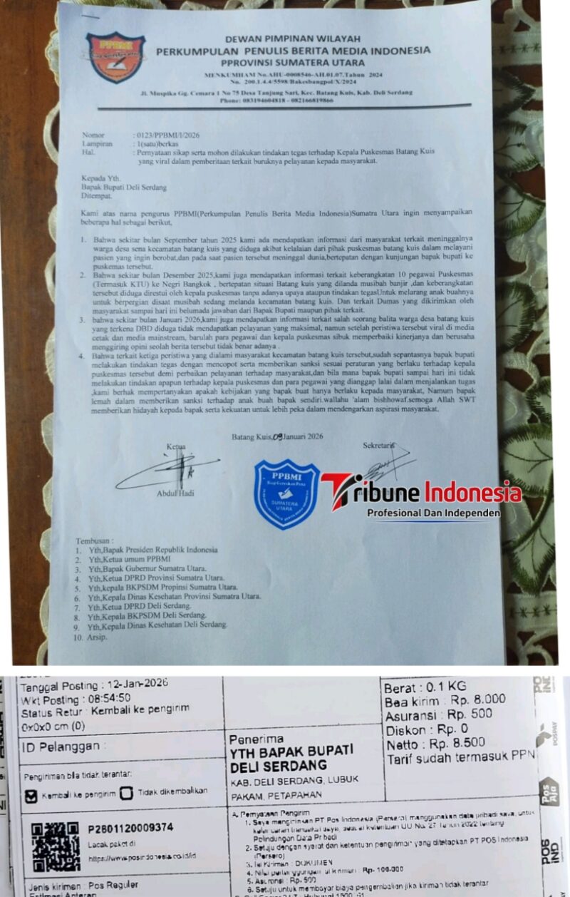 DELI SERDANG | TribuneIndonesia.com Perkumpulan Penulis Berita Media Indonesia (PPBMI) Sumatera Utara secara tegas mendesak Bupati Deli Serdang agar segera mengambil tindakan keras terhadap Kepala Puskesmas Batang Kuis. Desakan tersebut disampaikan melalui surat pernyataan sikap resmi bernomor 0123/PPBMI/I/2025 yang berisi rangkaian dugaan kelalaian pelayanan kesehatan yang dinilai mencederai hak dasar masyarakat.