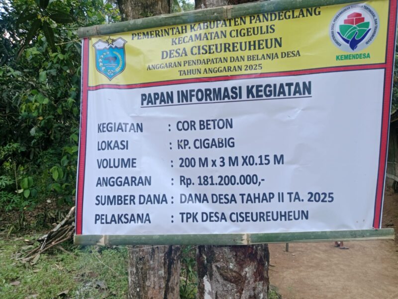 Proyek pembangunan cor beton di Kampung Cigabig, Desa Ciseureuhen, Kecamatan Cigeulis, Kabupaten Pandeglang, dengan volume 200 meter x 3 meter x 0,15 meter kini menjadi sorotan tajam. Proyek bernilai ratusan juta rupiah itu diduga dikerjakan asal jadi, upah pekerja tidak jelas, dan kuat indikasi terjadi praktik penyelewengan anggaran yang berpotensi menimbulkan kerugian negara.