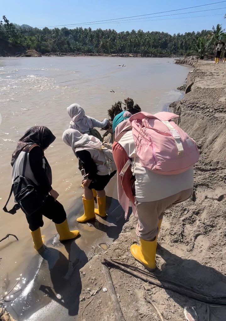 “Ketika terjadi banjir dan akses terputus dari Dusun Alue U, kami sudah mencoba berbagai cara untuk menghubungi warga di seberang, tetapi tidak bisa mengingat kondisi saat itu. Kemudian kami menggunakan alat semacam walkie talkie sederhana, barulah kami bisa