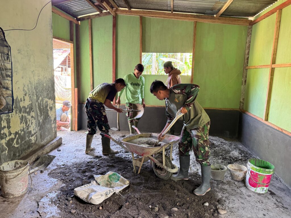 Setelah tahap pembongkaran dan pemasangan rangka selesai, Satgas TMMD bergerak cepat melanjutkan pekerjaan pada bagian struktur utama bangunan. Pemasangan dinding dilakukan secara bertahap dan presisi untuk memastikan kekuatan konstruksi, sementara pengecoran lantai dilaksanakan guna menciptakan dasar bangunan yang kokoh dan nyaman.