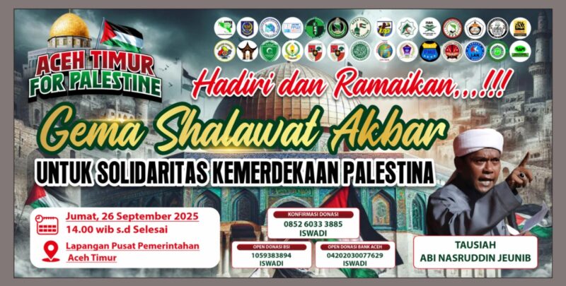 Gema Shalawat untuk Solidaritas Kemerdekaan Palestina yang diselenggarakan pada hari jumat 26 September 2025, sebanyak 32 organisasi yang tergabung dalam berbagai ORMAS, OKP, Komunitas Sipil, Mahasiswa dan Santri di Kabupaten Aceh Timur siap meramaikan Aceh Timur for Palestine.