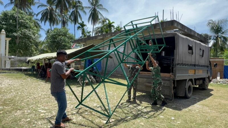 Dalam kegiatan tersebut, personel Satgas TMMD bersama warga setempat bahu-membahu menurunkan rangka tower air secara hati-hati dari atas kendaraan angkut. Proses penurunan dilakukan dengan penuh kehati-hatian dan mengutamakan faktor keamanan, mengingat ukuran dan bobot konstruksi besi yang cukup besar.