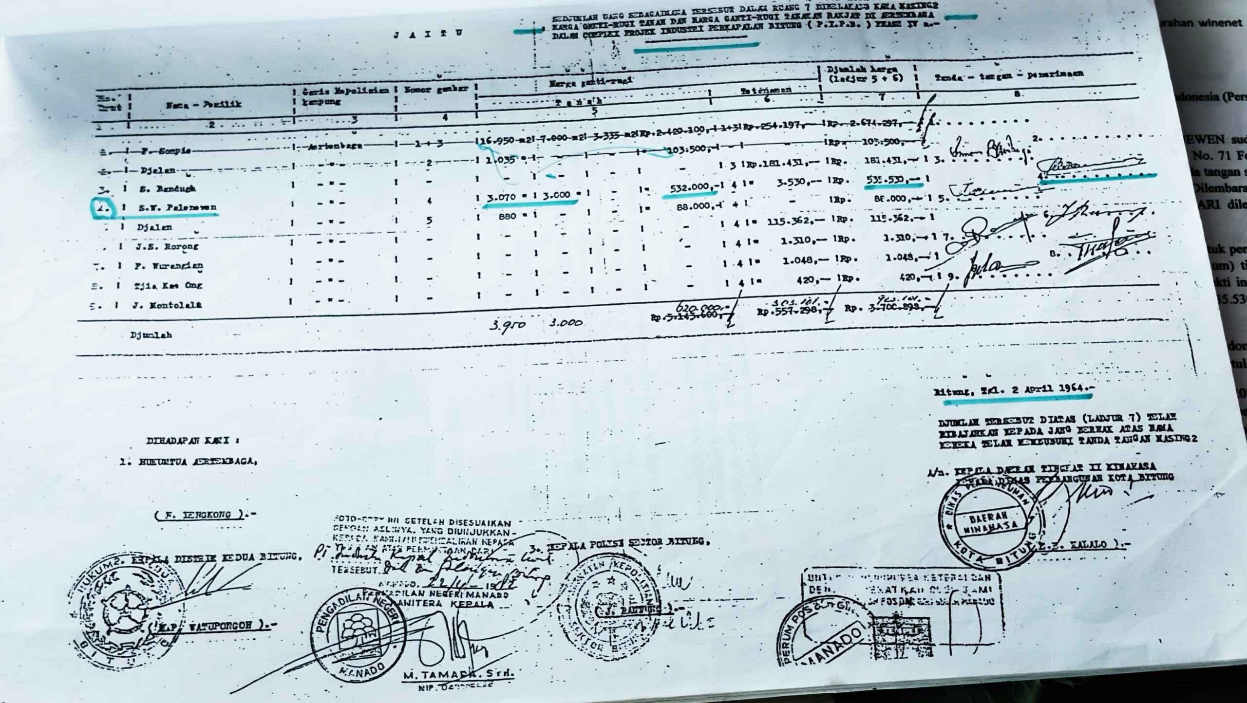 Menilik sisi historis, lahan keluarga Palenewen memang memiliki rekam jejak yang panjang dengan industri perkapalan. Dokumen register lama mencatat bahwa pada tahun 1964, sebagian lahan tersebut sempat dipinjam untuk proyek penimbunan galangan kapal.
