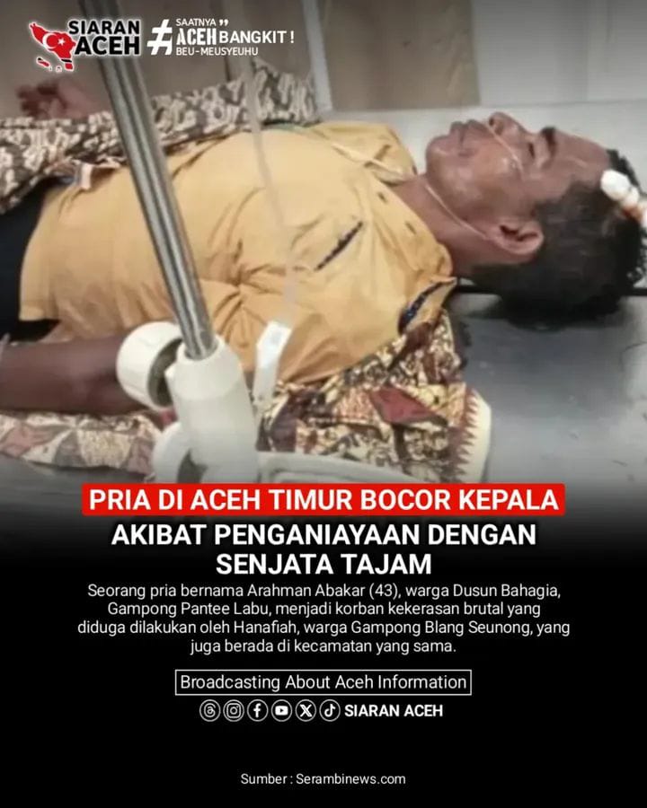 Seorang pria bernama Arahman Abakar (43), warga Dusun Bahagia, Gampong Pantee Labu, menjadi korban kekerasan brutal yang diduga dilakukan oleh Hanafiah, warga Gampong Blang Seunong, yang juga berada di kecamatan yang sama.
