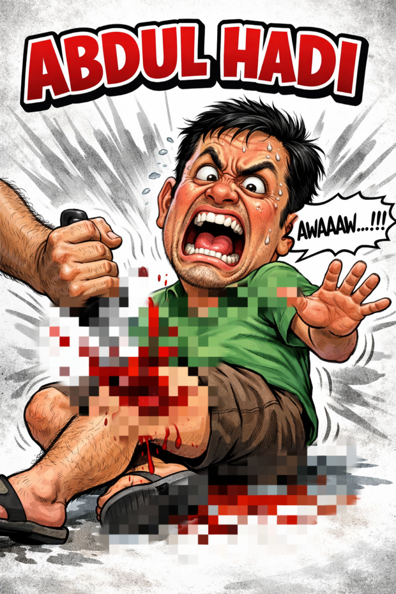 Tanpa banyak kata, salah seorang pelaku yang dibonceng langsung menyerang korban menggunakan senjata tajam jenis sangkur. Tikaman tersebut menghujam paha kanan Abdul Hadi hingga membuatnya terjatuh dari sepeda motor.