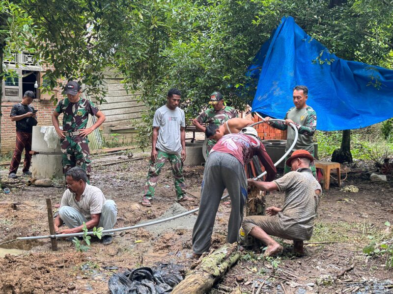Di tengah kondisi tanah yang lembab dan medan yang menantang, personel Satgas TMMD bersama masyarakat tampak bahu-membahu memasang instalasi pipa sumur. Dengan peralatan sederhana dan semangat gotong royong, proses pengerjaan dilakukan secara teliti agar sumur dapat berfungsi optimal dan berkelanjutan.