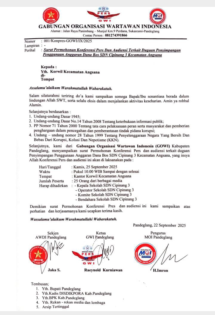 Dunia pendidikan di Kabupaten Pandeglang kembali diguncang. SDN Cipinang 3 Kecamatan Angsana diduga kuat menyalahgunakan Dana Bantuan Operasional Sekolah (BOS). Dugaan ini bukan sekadar isu liar, melainkan mendapat perhatian serius dari Gabung Organisasi Wartawan Indonesia (GOWI) yang resmi melayangkan surat permohonan konferensi pers dan audiensi ke Korwil Pendidikan Kecamatan Angsana. Acara itu dijadwalkan berlangsung pada Kamis mendatang.
