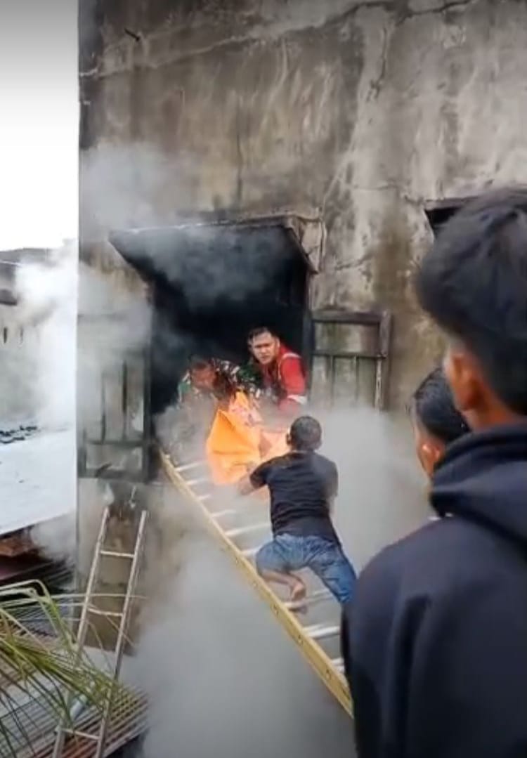 Upaya evakuasi berlangsung dramatis selama hampir tiga jam. Api yang masih menyala dari bahan plastik membuat tim dan warga kesulitan masuk. Korban akhirnya berhasil dievakuasi melalui jalur belakang dengan membobol bagian ventilasi.