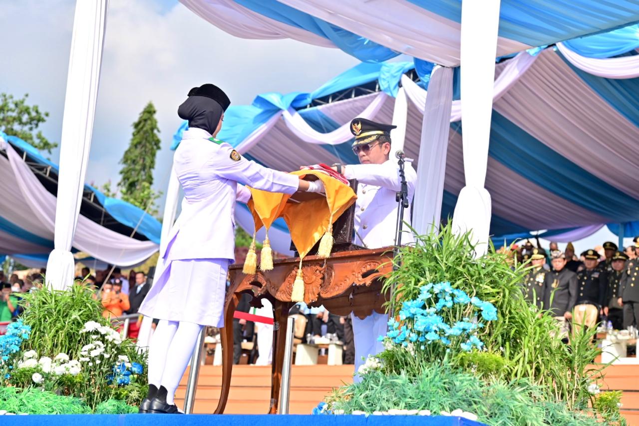 Dewani Lovena Putri, siswi SMA Kebangsaan, dipercaya sebagai pembawa baki bendera. Dengan langkah tegap, ia menerima bendera dari Inspektur Upacara.