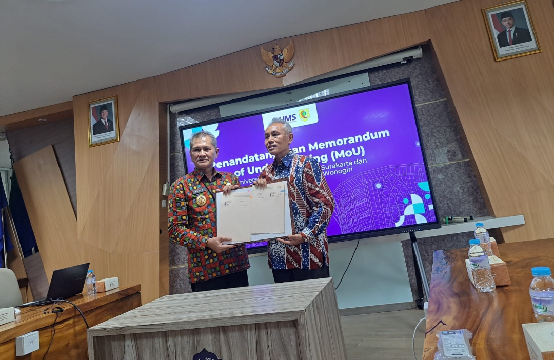 Surakarta | Rabu, 15 Oktober 2025 Universitas Muhammadiyah Surakarta (UMS) dan Pemerintah Kabupaten Wonogiri resmi menandatangani Nota Kesepahaman (MoU) tentang kerja sama dalam bidang pendidikan, penelitian, dan pengabdian kepada masyarakat. Kegiatan penandatanganan berlangsung di Ruang Sidang Badan Pembina Harian (BPH) Lantai 6, Gedung Induk Siti Walidah Universitas Muhammadiyah Surakarta.