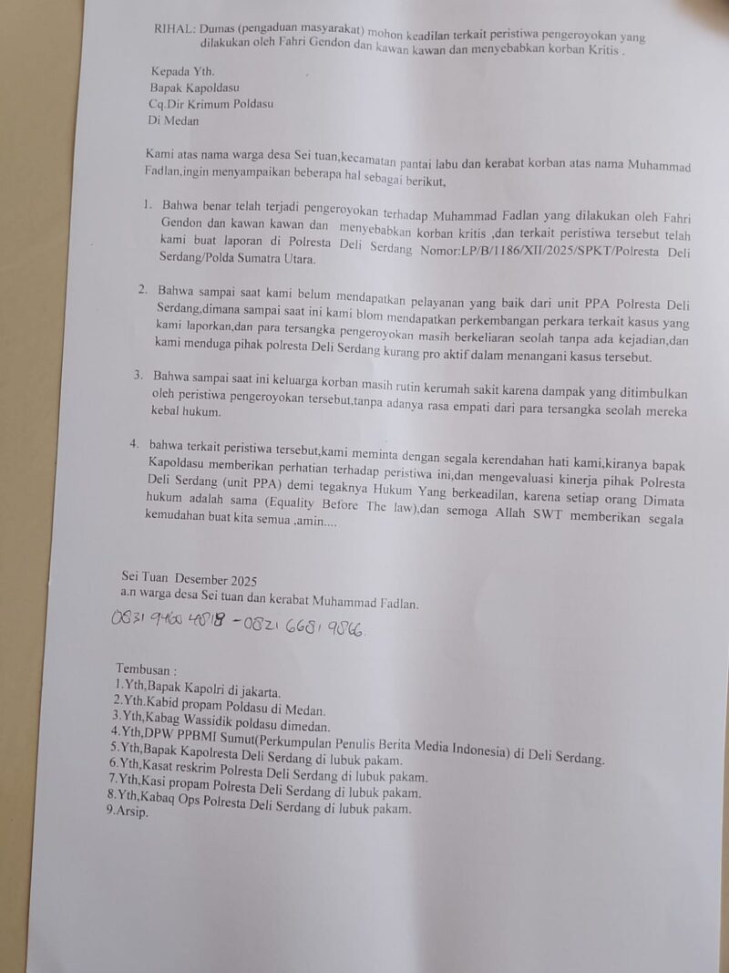 Melalui Dumas yang dilayangkan ke Poldasu, warga meminta Kapolda Sumatera Utara turun tangan langsung, melakukan evaluasi menyeluruh terhadap kinerja oknum-oknum di Polresta Deli Serdang yang dinilai tidak profesional dalam menangani perkara pengeroyokan tersebut.